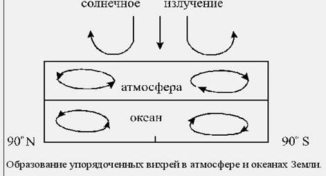 Циркуляционные потоки в атмосфере и океанах Земли - под действием солнечного излучения - самоорганизация на Земле.