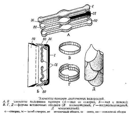 Панцирь диатомовых водорослей состоит из двух половинок: большей эпитеки и меньшей гипотеки. Каждая половинка образована створкой, которая своим загибом соединяется с поисковым кольцом или ободком. Свободный край пояскового кольца эпитеки надвинут на свободный край пояскового кольца гипотеки, как крышечка на коробочку. У многих диатомей между загибом створки и поясковым кольцом возникают вставочные ободки различной формы и в разном количестве. Эти ободки появляются последовательно, причем каждый вставочный ободок формируется между загибом створки и последним из ранее образовавшихся вставочных ободков. Таким образом самый молодой вставочный ободок всегда граничит с загибом створки, а самый старый — с поясковым ободком. На вставочных ободках развиваются септы — неполные кремнеземные перепонки, расположенные или вдоль всей внутренней поверхности вставочного ободка, или на одном из его полюсов. Септы всегда имеют одно или несколько отверстий, перегораживая полость клетки на сообщающиеся между собой отсеки. Образование вставочных ободков обусловливает возможность роста клетки вдоль ее центральной оси, соединяющей центры двух створок. Различные части панциря плотно сцементированы вместе, иногда связаны сложными закраинами. Раздвигание эпи- и гипотеки наблюдается только при делении клетки и во время образования ауксоспор. Створки у одних диатомовых, объединяемых в класс центрофицие-вые, обычно округлых очертаний, например у рода циклотелла, и панцирь в целом может быть уподоблен круглой коробочке. Реже створки треугольные, как у трицера-циума, или эллиптические, как у рода биддульфия. Элементы скульптуры, представленные в первую очередь порами различных типов, размещаются на створках вокруг центральной точки, а у родов с округлыми створками обычно располагаются радиально. У других диатомовых, составляющих класс пеннатофициевых, створки эллиптические или продолговатые, например у родов пин-нулярия и навикула, у некоторых, как у синед-ры, длина их во много раз превосходит ширину.