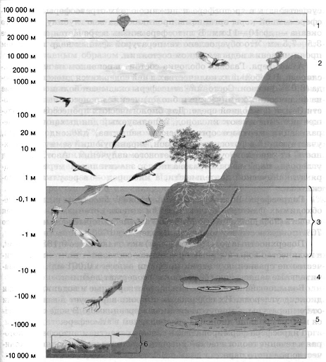 1 – уровень озонового слоя, задерживающего жесткое ультрафиолетовое излучение; 2 – граница снегов; 3- почва; 4 – животные, обитающие в пещерах; 5 – бактерии в нефтяных скважинах; 6 – придонные организмы